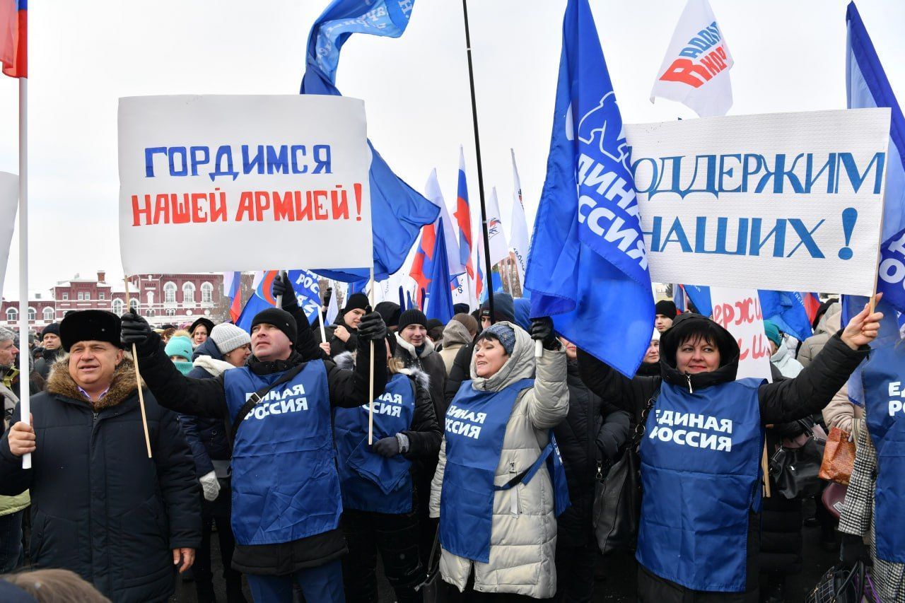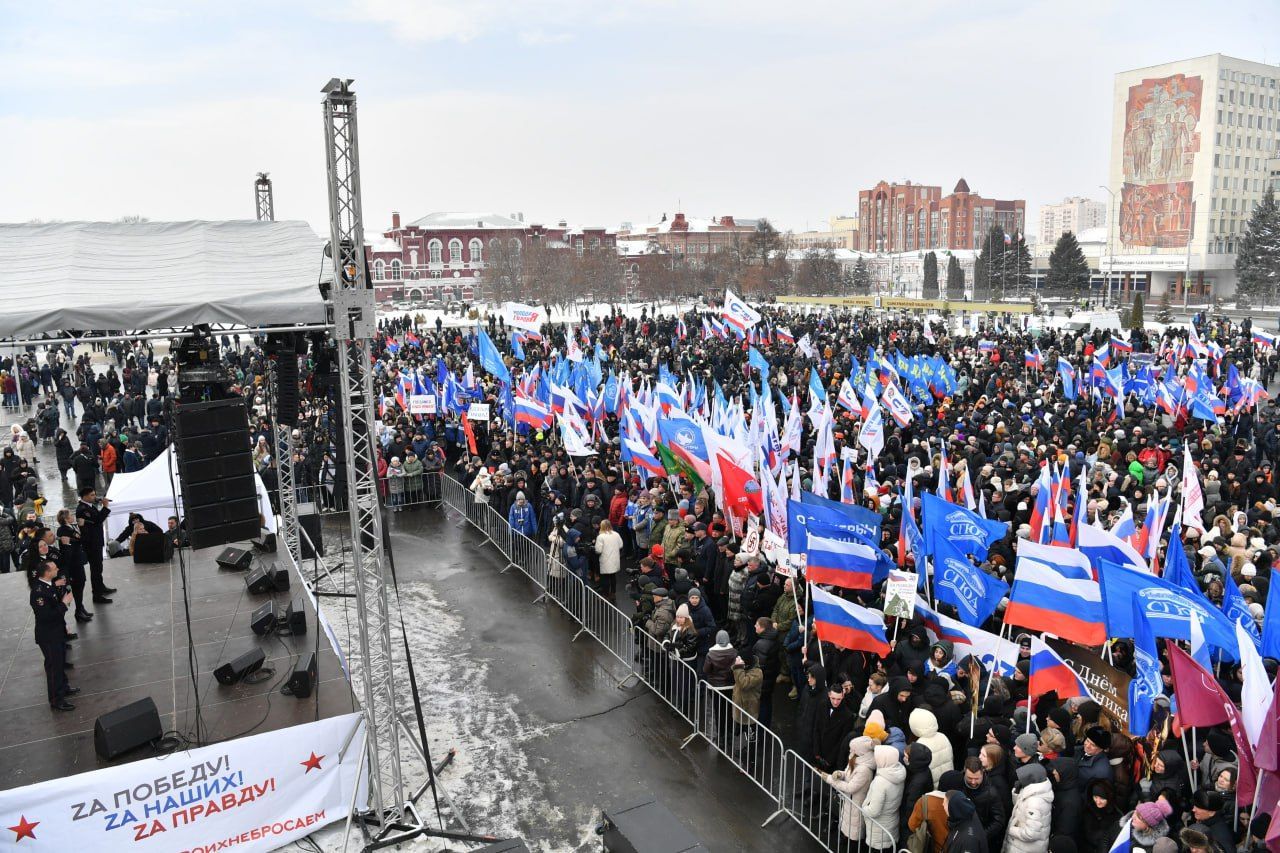 Поддержать нашего президента и военнослужащих пришли 10 тысяч человек. С главной сцены города звучали патриотические песни и стихи в исполнении местных коллективов. Также перед саратовцами выступил губернатор Роман Бусаргин: