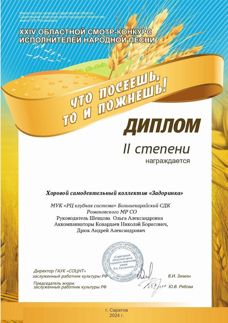 В городе Аткарске прошел XXIV областной смотр-конкурс исполнителей народной песни «Что посеешь, то и пожнешь!». В этом году Романовский район был представлен хоровым самодеятельным коллективом «Задоринка» Большекарайского СДК.