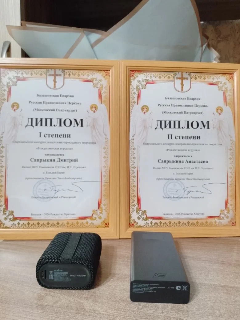Было отправлено 5 работ, и победителями в своих возрастных номинациях стали сестра и брат Сапрыкины Анастасия и Дмитрий из села Большой Карай. По итогам конкурса они заняли 2 и 1 места соответственно, были приглашены на традиционную Архиерейскую елку в честь праздника и получили награды из рук епископа Балашовского и Ртищевского Тарасия и ценные подарки. Дети дома поделились массой своих эмоций от этого мероприятия, ездили они на него всей семьей. А работы Анастасии и Дмитрия выставлены среди работ других участников конкурса в Балашовском музее.