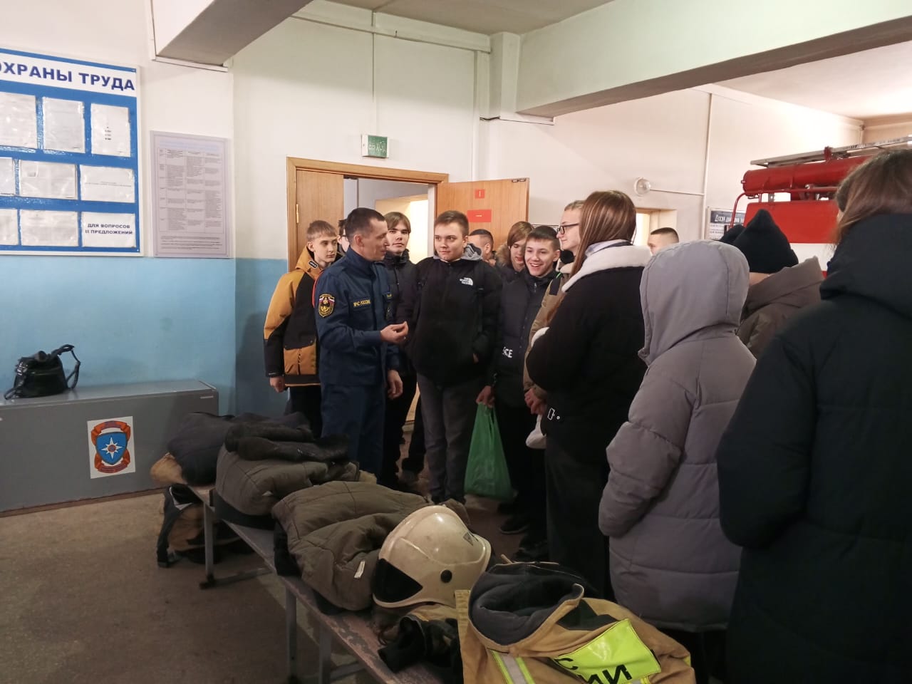 Начальник караула Владимир Арюшин рассказал ребятам о специальностях, связанных с пожарной безопасностью, о работе сотрудников МЧС, о профильных учебных заведениях региона, о требованиях к курсантам МЧС и предметах, которые надо сдавать при поступлении. Сотрудники МЧС провели экскурсию по пожарно-спасательной части, наглядно показали весь процесс от поступления звонка до выезда готового экипажа на задание.