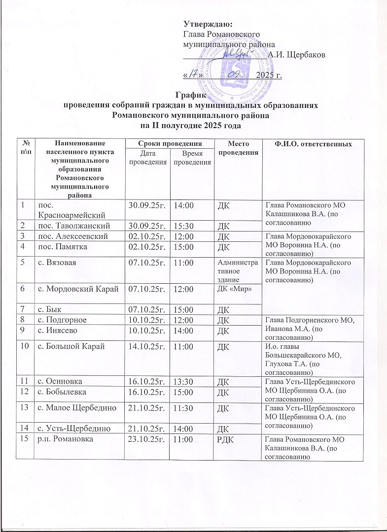 График проведения собраний граждан в муниципальных образованиях Романовского района на 2 полугодие 2025 года