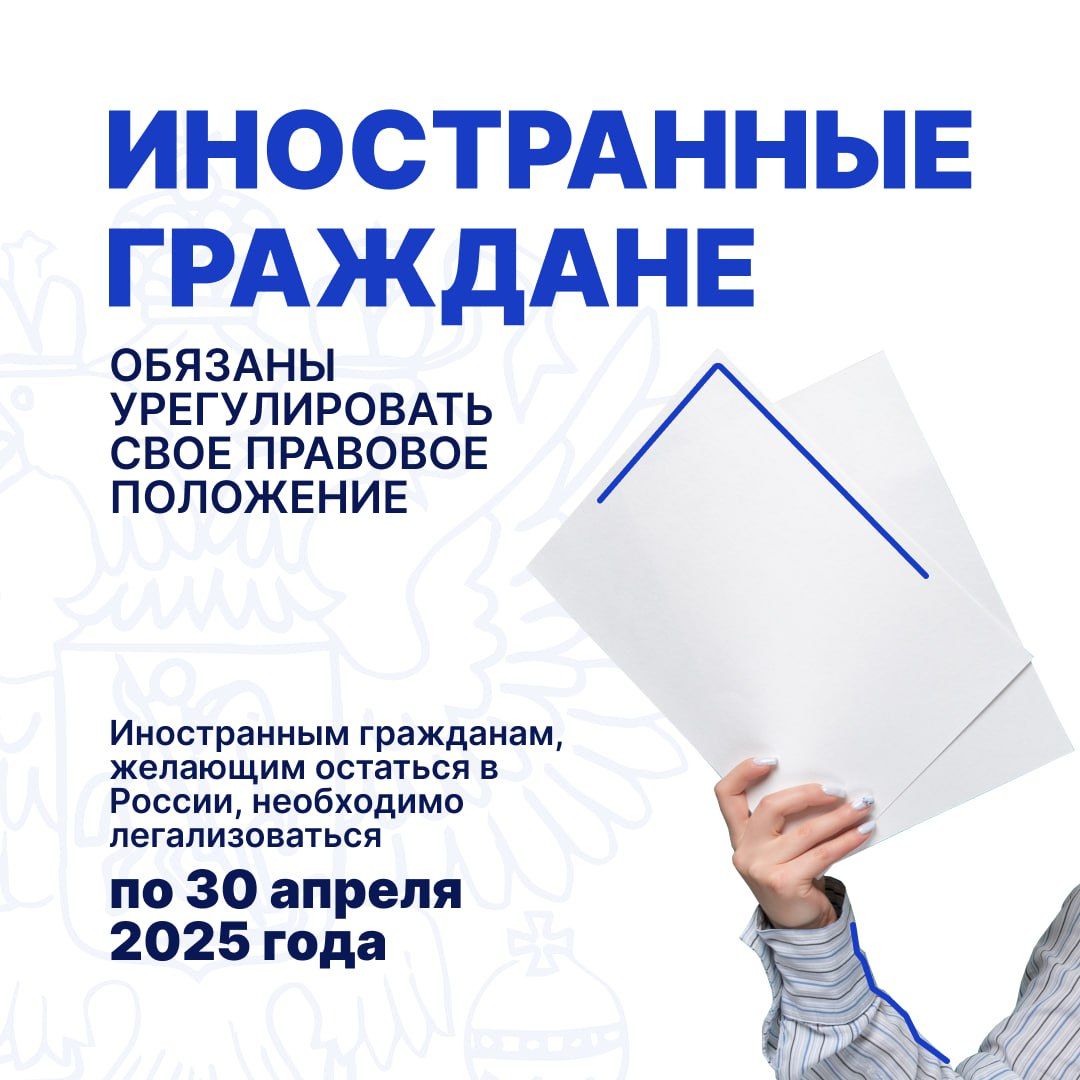 Иностранным гражданам, желающим остаться на территории России, необходимо легализоваться. Для этого необходимо по 30 апреля 2025 года обратиться с пакетом документов в отдел по вопросам миграции территориального органа внутренних дел или в филиал паспортно-визового центра МВД России.