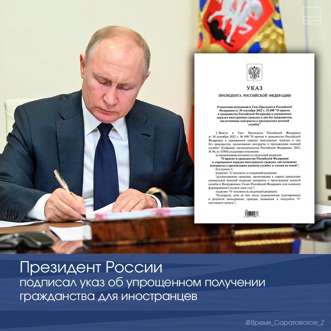 Президент России Владимир Путин подписал указ, который позволяет иностранным гражданам, заключившим в период проведения СВО контракты на прохождение военной службы в Вооруженных силах РФ, получить гражданство России в упрощенном порядке.