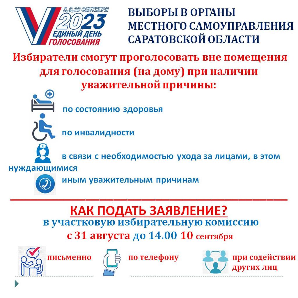 Избиратели смогут проголосовать вне помещения для голосования (на дому) при наличии уважительной причины: по состоянию здоровья; по инвалидности; в связи с необходимостью ухода за лицами, в этом нуждающимися; иным уважительным причинам.