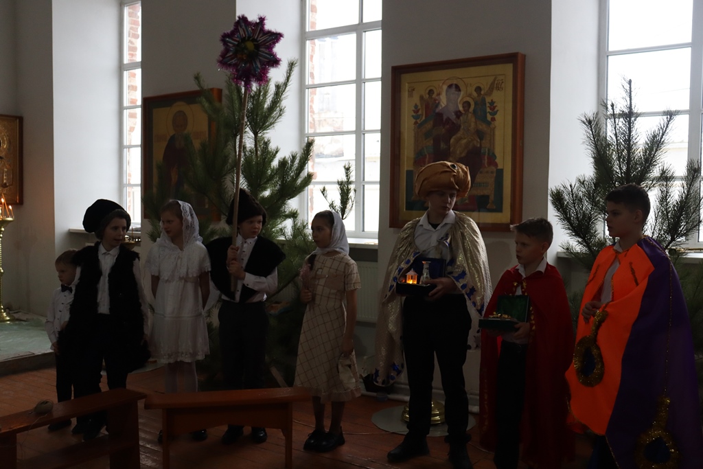 А утром 7 января для маленьких прихожан и жителей райцентра состоялся утренник в храме. Этой традиции больше 25 лет и она одна из самых ожидаемых. Представление показали воспитанники Воскресной школы и поздравили обучающиеся и педагоги детской школы искусств, дети прочли стихи о Рождестве. С праздником поздравили настоятель храма иерей Павел Денисов и клирик храма иерей Сергий Чуприков. По окончании дети получили сладкие подарки от ИП С.Н. Ребицкого (г. Люберцы). В районном Доме культуры все выходные можно было посмотреть на работы победителей конкурса «Новогодний серпантин». В числе прочих номинаций семьями изготовили и представили Рождественские вертепы в честь престольного праздника. А 8 января на сцене РДК состоялся фестиваль “Рождественская звезда”, собравший здесь маленьких талантливых участников и творческие коллективы. На сцене выступили участники коллективов: ”Вельвет”, “Талисман”, танцевальные коллективы хастл-клуб “ Ритм” и “Фиеста”, цирковая студия “Романтик”. А также театральная студия “Линия”, открывая фестиваль спектаклем “Рождественская ночь”.