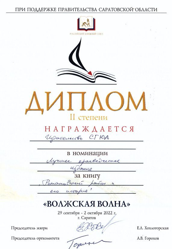 На этой выставке издательство Саратовской государственной юридической академии ежегодно представляет те книги, которые выпускает. В этом году в их числе и первая часть второго тома региональной энциклопедии «Романовский район и его история» Виктора Ивановича Грабенко. Данное издание было высоко оценено организаторами и членами жюри, и книга В.И. Грабенко получила диплом II степени в номинации «Лучшее краеведческое издание».