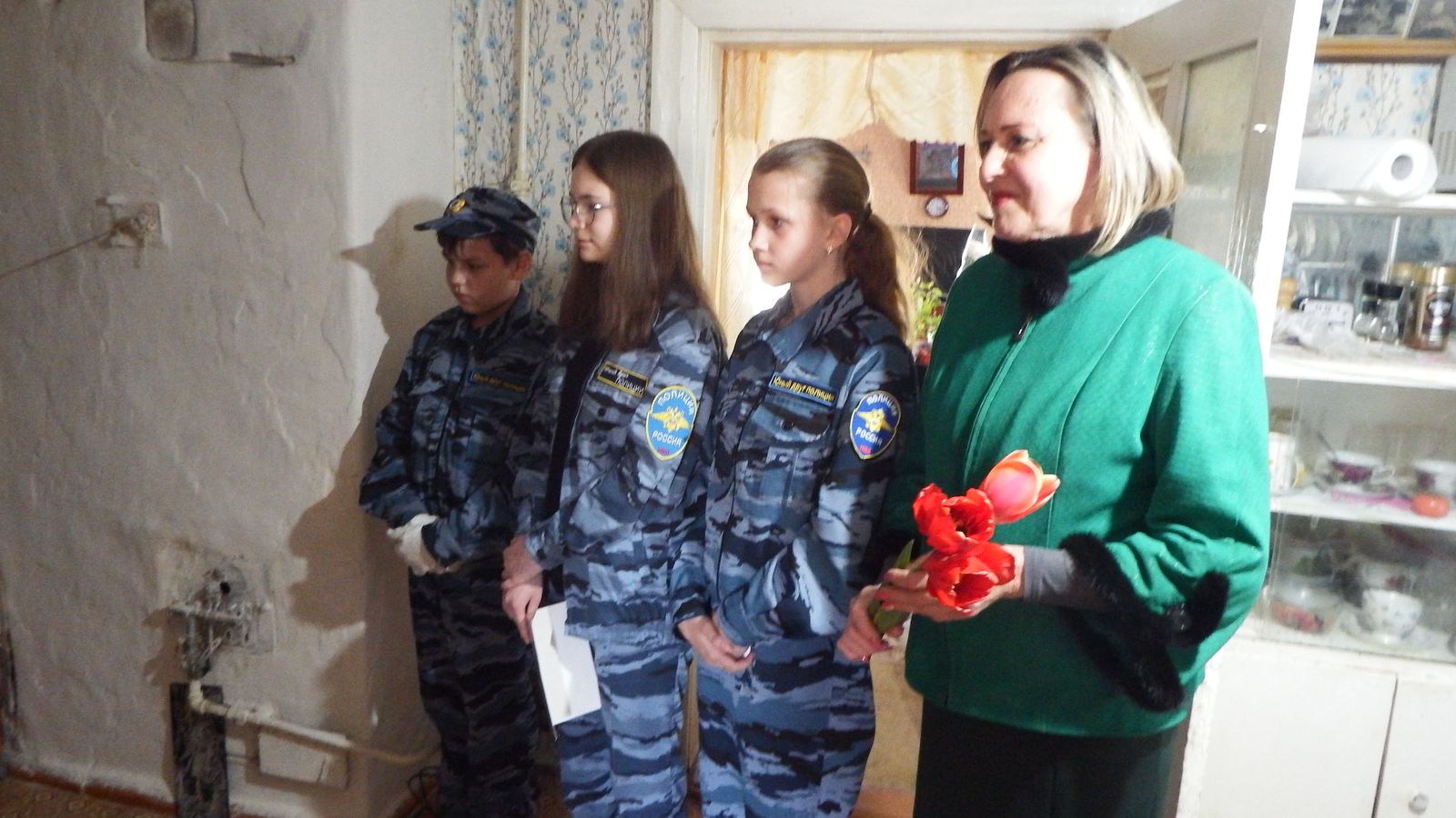 В торжественной акции приняли участие члены отряда правоохранительной деятельности «Юный друг полиции» из Романовской школы и представители Общественного Совета при МО МВД России «Балашовский». Ребята прочли для ровесников тех лихих лет трогательные стихи, от исполнения которых неподдельные эмоции отражались на лицах присутствующих. Ветерану и узнице были вручены букеты цветов и подарки в виде продуктовых наборов к 9 мая.