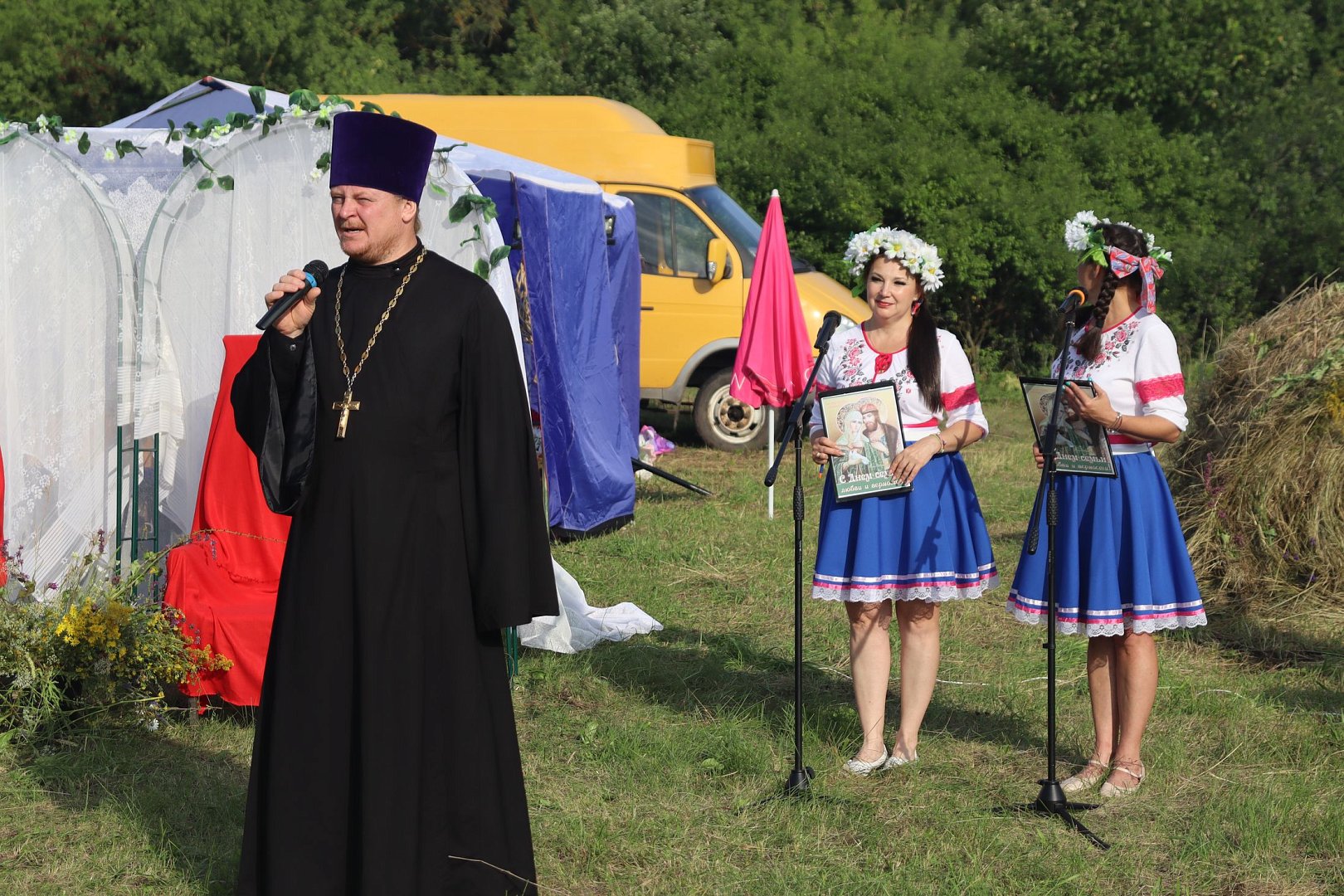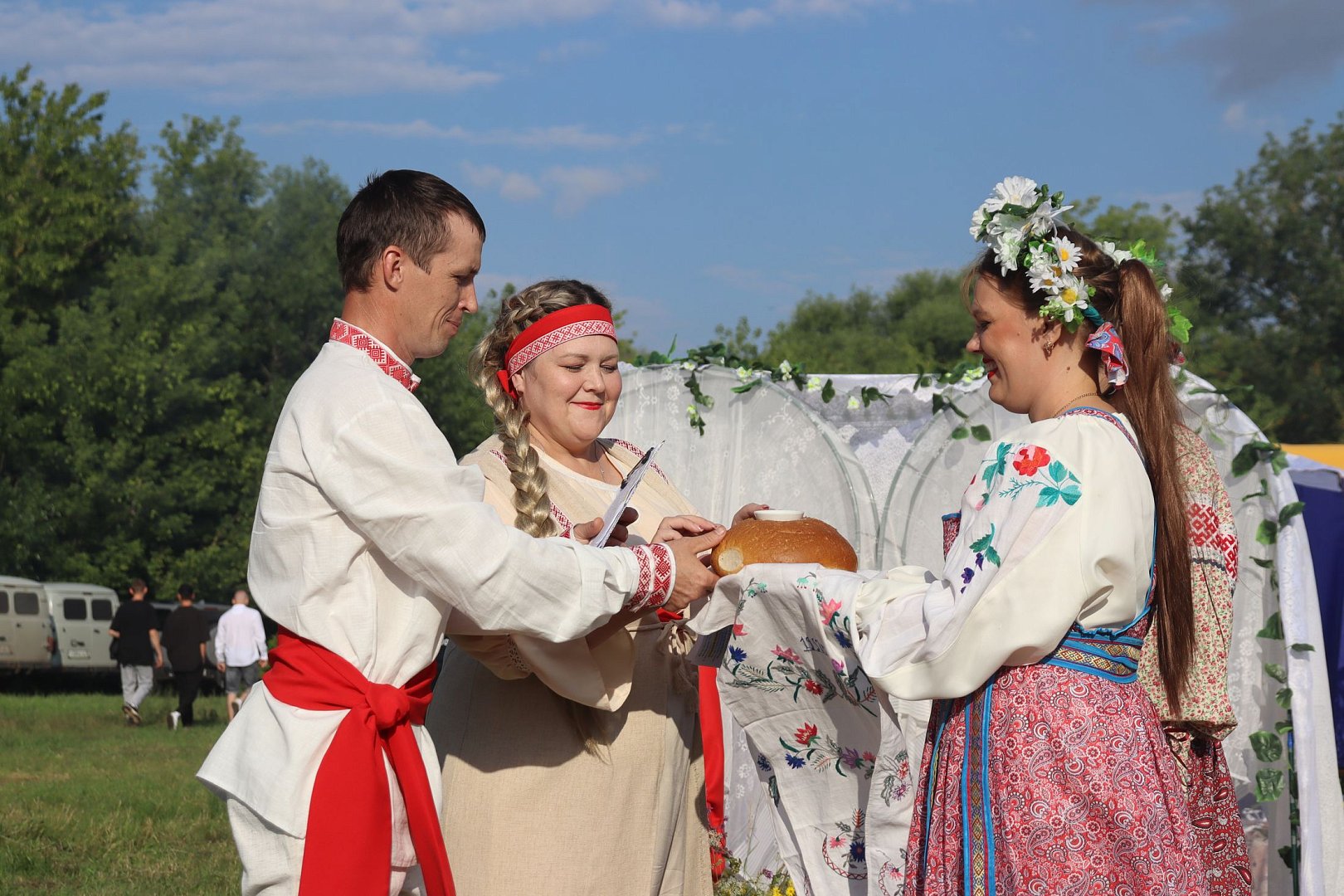Ведущие семейного праздника А. Козлова и Н. Кондратьева рассказали участникам о красивой истории Петра и Февронии, оповестили гостей о прибытии на фестиваль главных героев этого торжества – символизирующих благоверных супругов Муромских. Долгими аплодисментами и полевыми букетами гости приветствовали появившихся на празднике: Петра и Февронию Муромских (супруги Владимир и Юлия Арюшины).