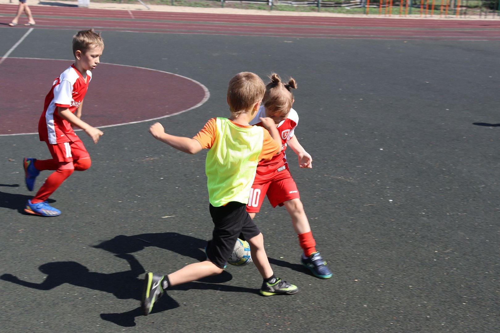 На школьном стадионе собрались юные спортсмены, чтобы принять участие в праздничных спортивных баталиях.