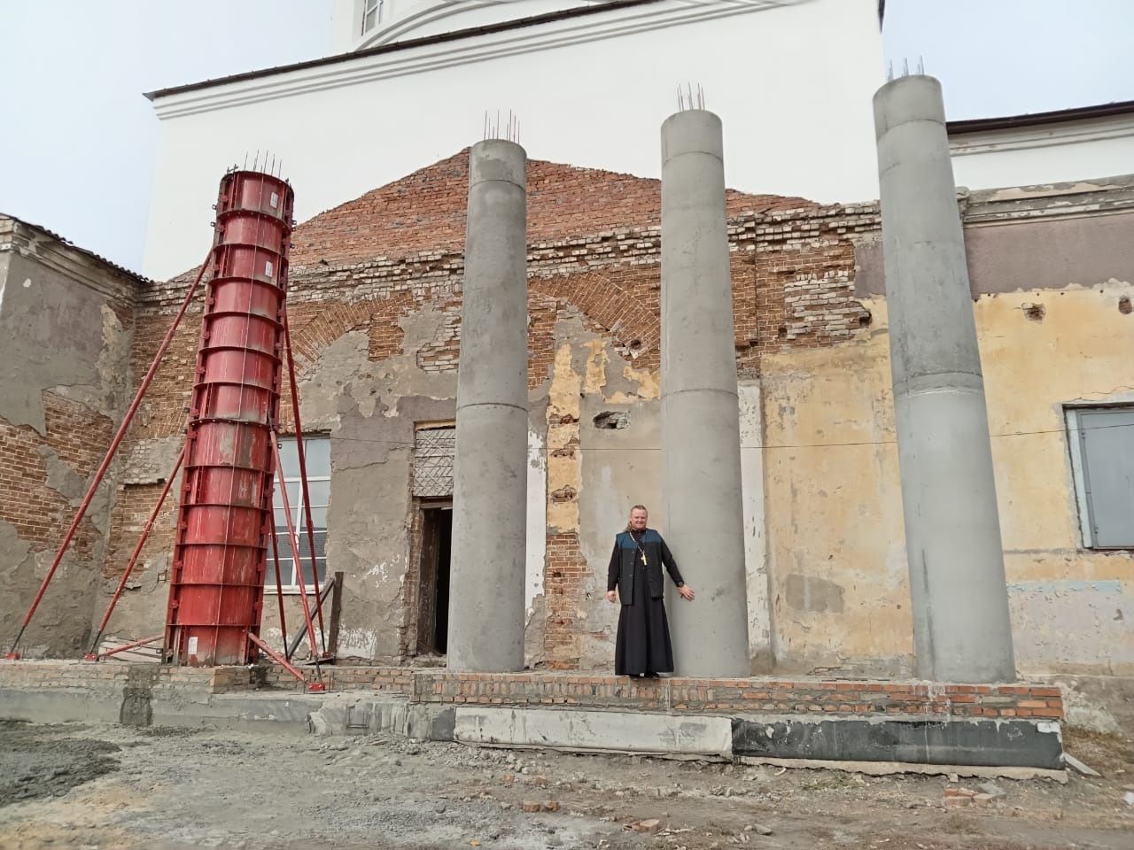 - За прошлый год и этот год, если суммировать и время, и результат работ, то нельзя его оценить с положительной точки зрения, потому что он небольшой. В этом году работы было проделано достаточно – поштукатурена внутренняя часть центрального барабана, все стены, вставлены окна, поштукатурен, покрашен свод, т.е. от отметки 24 метров до 6 метров проведены штукатурные работы. Все они были оплачены нашим меценатом А.Н. Рязановым, а окраска и шпаклевка КФХ Мялкиной О.В. и жителями района. Также был разобран тот потолок советского периода, стоявший на колоннах в Доме культуры, которым был наш храм почти 50 лет с 1941 года. Очень многие жители подходили и спрашивали, сохранятся ли эти колонны, которые были им почему-то очень дороги. Нет, я вынужден всех огорчить - не сохранились, они не представляли никакой исторической и культурной ценности. Разобрали и вывезли потолок, теперь войдя внутрь, вы можете видеть купол храма, то есть ту архитектуру, которая, предположительно, была у храма изначально. В настоящее время ведутся наружные работы. То, что вы видите сейчас - красные конструкции - это опалубка под железобетонные колонны, в которые вставлена арматура, заливается бетон и таких колонн будет 12 штук. Первоначально предполагалось, что колонны будут в виде кирпичной трубы, а в них заливается бетон, но наш меценат А.Н. Рязанов предложил, как опытный человек в строительстве, свою инициативу, отметив, что это будет быстрее, аккуратнее и проще. Он оплатил нам эту опалубку, которая с доставкой тоже имеет достаточную стоимость. Если вернуться к работам минувшего года, то колонны у нас стоят не на пустом месте, если оценивать работы с точки зрения видимости, то наши работы были незаметны - они были, если можно так образно выразиться, «закопаны в землю». Это сваи, которые закопаны в землю на 4 метра в глубину, и никто их не видит, это ростверки, которые также находятся на нулевой отметке, так называется свайно-ростверковый фундамент. И вот на них уже будут стоять колонны.