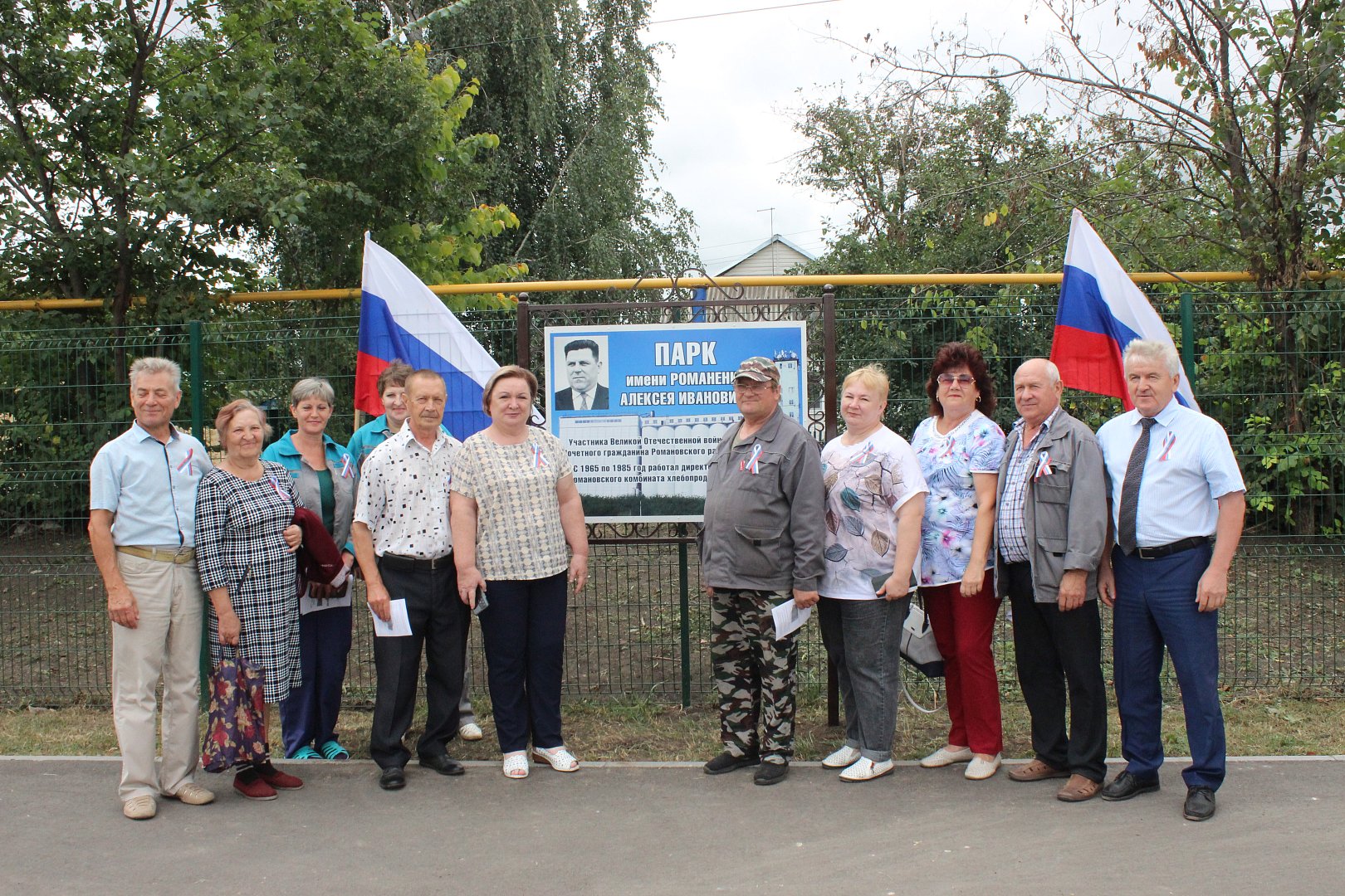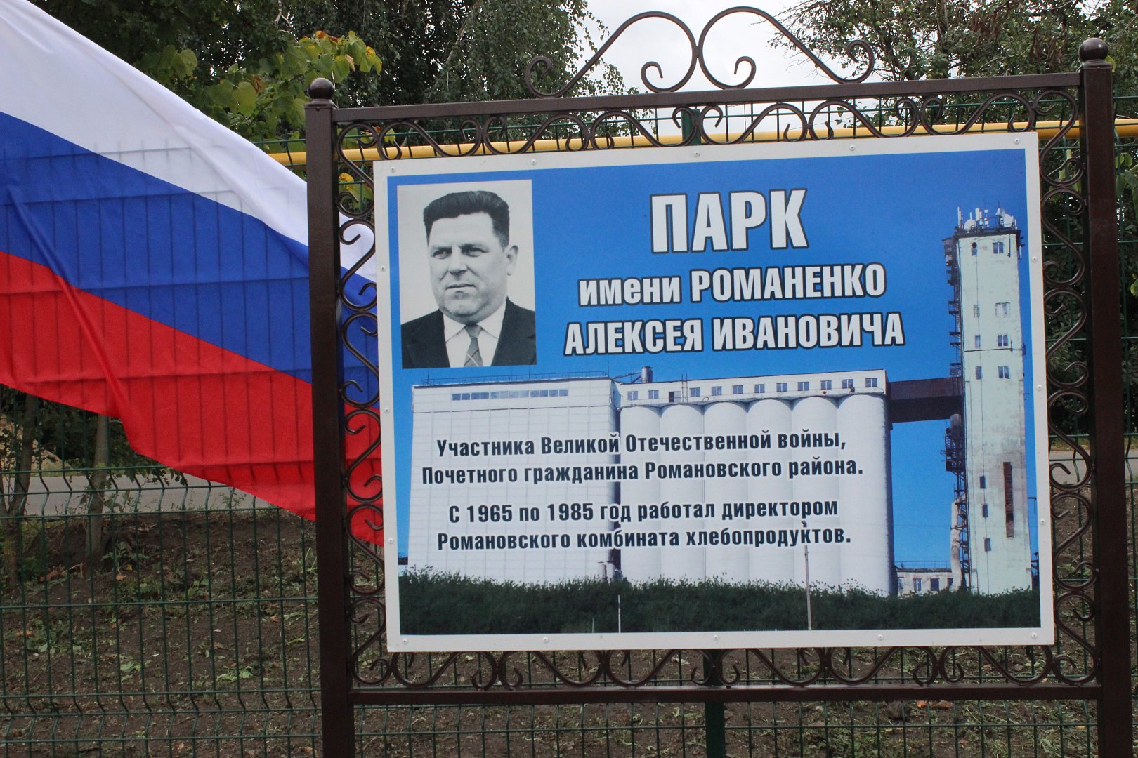 Совсем недавно районная газета писала о том, как был открыт новый парк в районе «завода» в р.п. Романовка. Тогда же главой района А.И. Щербаковым была вынесена инициатива, поддержанная жителями, о присвоении парку имени Почетного гражданина района, ветерана Великой Отечественной войны Алексея Ивановича Романенко. И в преддверии 95-летнего юбилея района состоялось открытие Памятной Доски в честь А.И. Романенко.