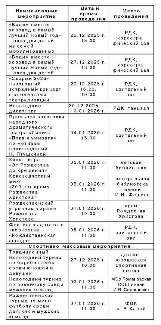 План массовых мероприятий на Новогодние и Рождественские праздники