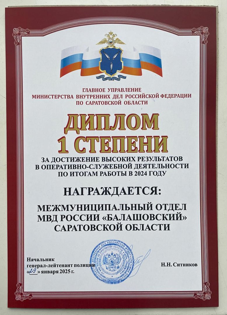 Дипломом I степени награжден межмуниципальный отдел МВД России «Балашовский» Саратовской области.