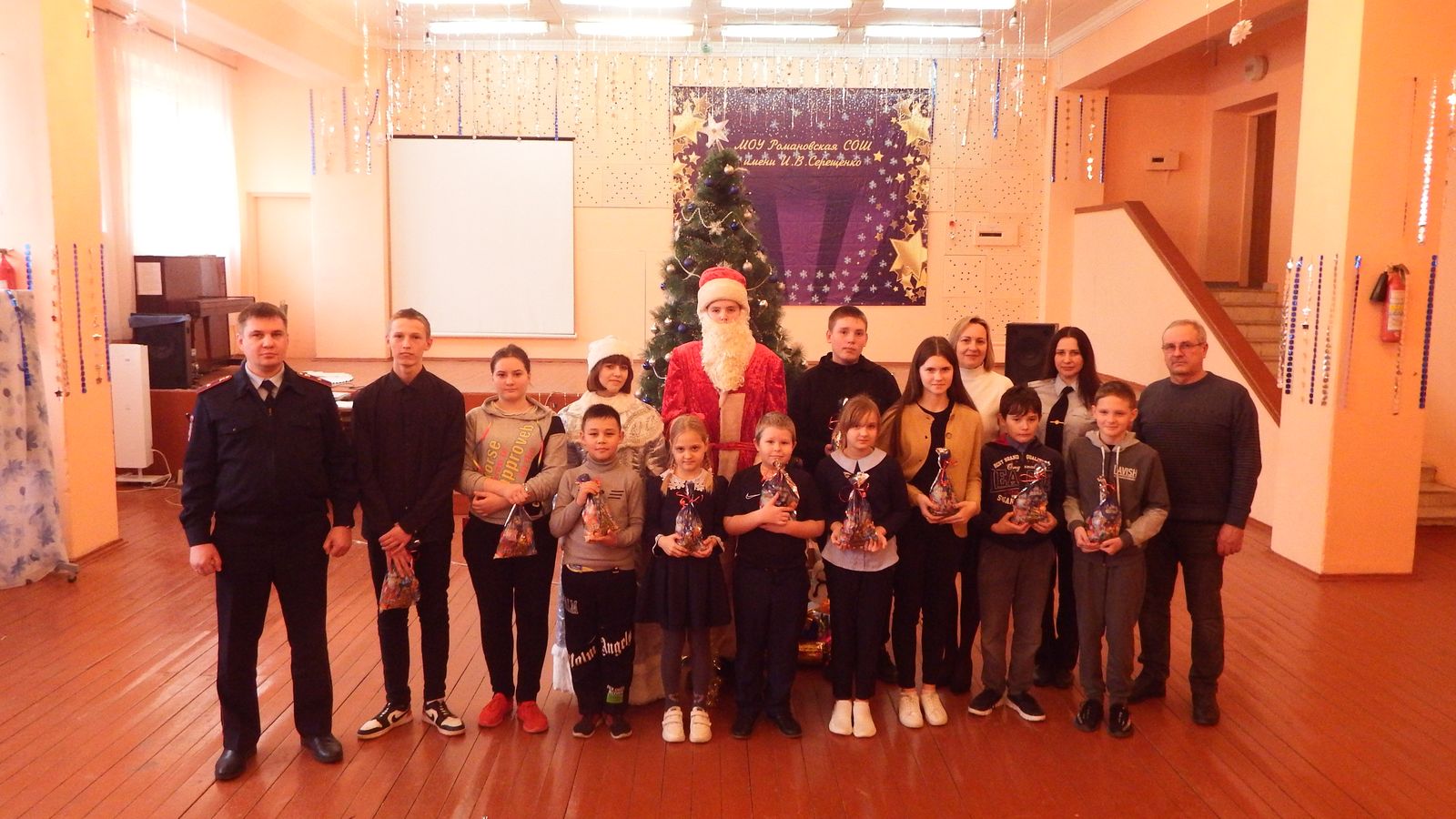 Для ребят приготовили теплое выступление с участием волшебных персонажей - Деда Мороза и Снегурочки. Перед детьми выступил начальник ОП №1 майор полиции Н.Ю. Коробов, рассказавший об истории праздника и пожелавший ребятам исполнения желаний. Их поздравили с наступающим праздником члены Общественного совета, педагоги школы и ребята из ЮДП и вручили небольшие подарки со сладостями. Очень хотелось, чтобы все собравшиеся в зале дети почувствовали нашу поддержку, именно в то время, когда члены их семей защищают Россию. После поздравления все сделали общее фото под елкой. Но на этом волшебники из полиции – Дед Мороз и Снегурочка не остановились, решили поздравить ветеранов службы МВД. Для них подготовили небольшие сладкие подарки к чаю, трогательные поздравления в стихотворной форме. В этом году волшебники с детьми из ЮДП посетили несколько человек. Среди них: А.А.Титов, М.И. Лутцев, В.И. Пятибратов. Со временем в период следующих торжеств юные друзья полиции из Романовки планируют еще посетить ветеранов, проживающих в районном центре. Надеемся, что к подобным акциям присоединятся и члены ЮДП из сельских отрядов. А пока скажем, что немало историй и ответных пожеланий мы услышали от ветеранов МВД. Им есть о чем рассказать и чем поделиться с юными последователями. Возможно, среди этих ребят растет их смена.