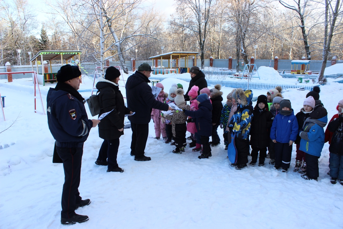 С воспитанниками детского сада дорожным полицейским в игровой форме на улице было проведено обучающее практическое занятие «Безопасная горка». Мальчишкам и девчонкам рассказали основные правила, которыми должен руководствоваться юный любитель санок и тюбинга. Дети внимательно слушали гостей, задавали им вопросы и продемонстрировали свой зимний инвентарь – санки, ледянки, «ватрушки».