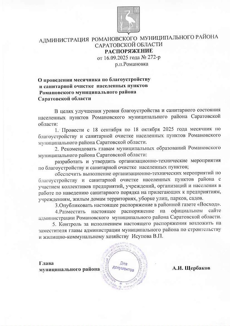 Распоряжение № 272-р «О проведении месячника по благоустройству и санитарной очистке населенных пунктов Романовского муниципального района Саратовской области»