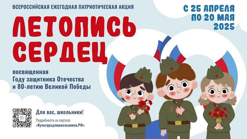 С 25 апреля по 20 мая 2025 года в рамках межведомственного культурно-образовательного проекта «Культура для школьников» пройдет Всероссийская ежегодная патриотическая акция «Летопись сердец», посвященная Году защитника Отечества и 80-летию Великой Победы.