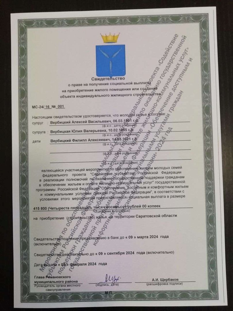 Глава Романовского муниципального района А.И. Щербаков вручил молодой семье из р.п. Романовка, семье Вербицких - свидетельство о праве на получение важной для них социальной выплаты, в рамках реализации муниципальной программы «Обеспечение жильем молодых семей» в Романовском районе.