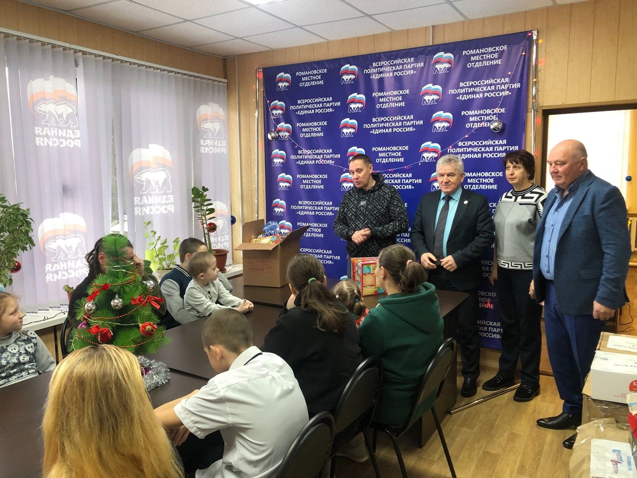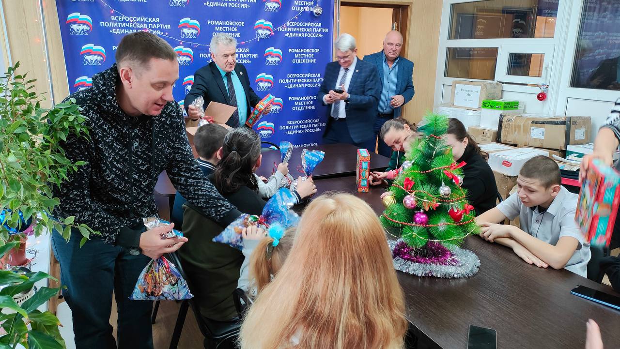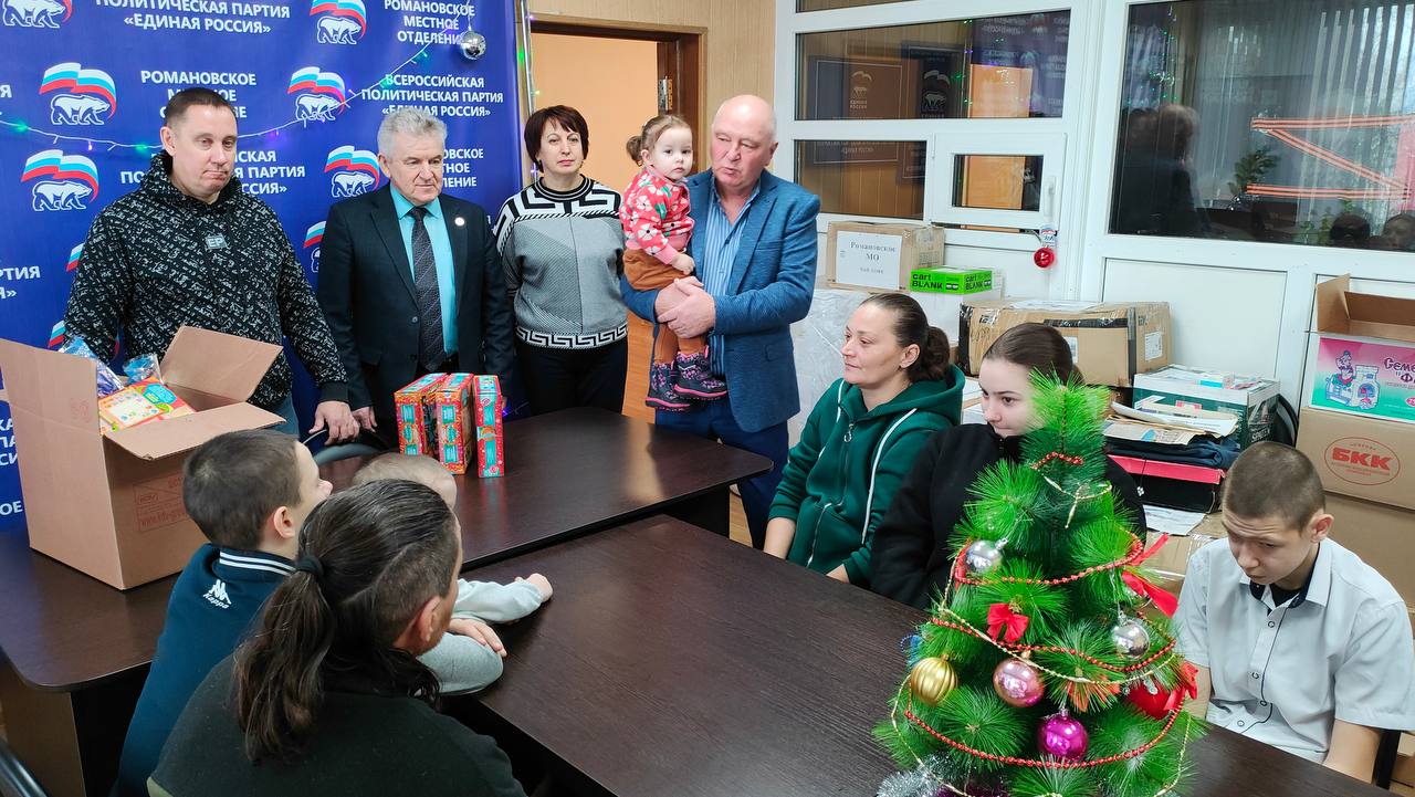 Члены семей военнослужащих пришли на прием в преддверии Нового года с детьми. После завершения официальной части приема состоялась приятная миссия - поздравление с Новым годом ребят из многодетных семей наших бойцов. Дети получили сладкие подарки. В праздничном мероприятии приняли участие глава Романовского муниципального района А.И. Щербаков, председатель Муниципального Собрания района, секретарь местного отделения партии «Единая Россия» Н.В. Швецов, руководитель депутатской группы «Единая Россия» Муниципального Собрания С.П. Хохлова. Каждому вручили по сладкому подарку и еще по подарку в нагрузку для каждого братика или сестренки, если они не смогли прийти.