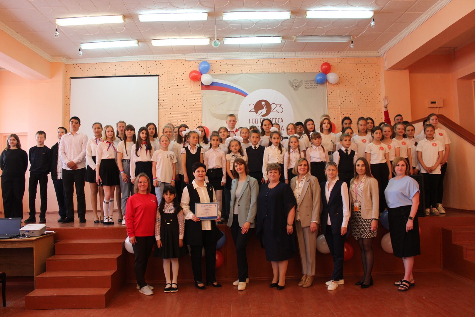 Ну и в завершение общее произнесение речевки «Я в движении - мы в движении, мы в движении - всегда в движении». И общее фото на память об этом историческом событии. По завершении мероприятия, здесь же в актовом зале РСОШ, прошла интеллектуальная игра брейн-ринг, посвященная 78-й годовщине Победы.