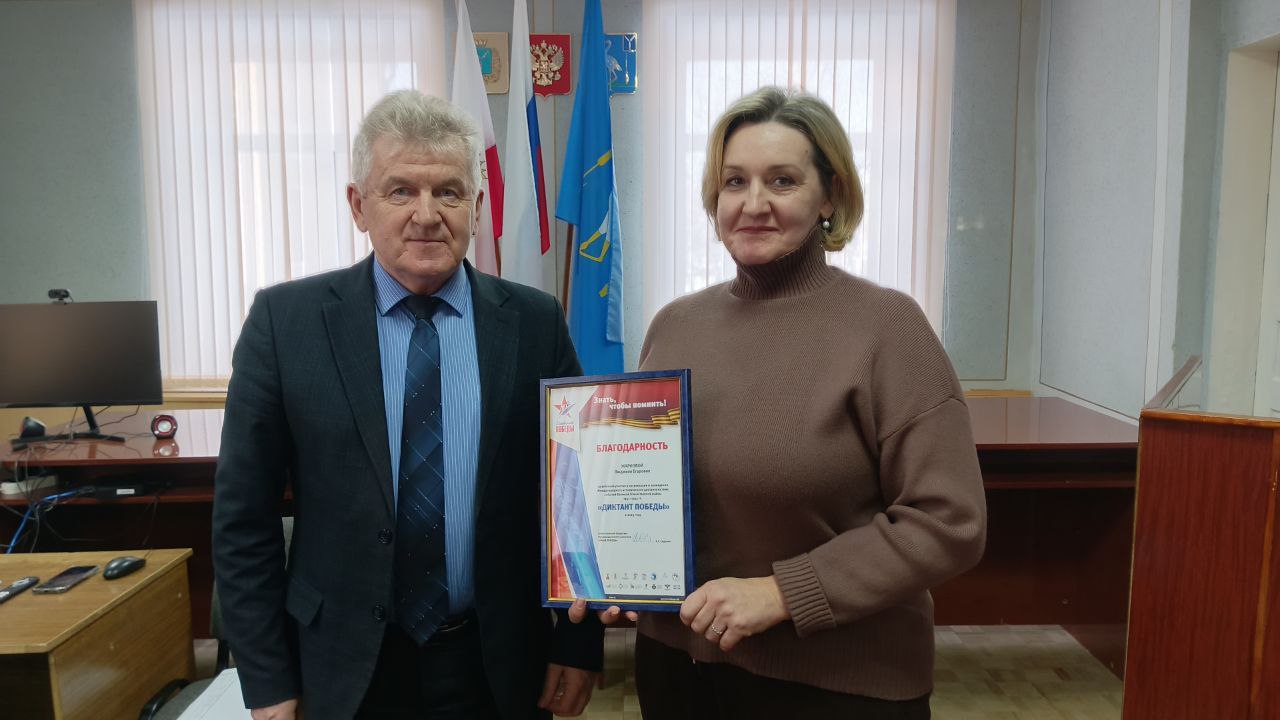 Директору филиала МОУ Романовская СОШ им. И.В. Серещенко в с. Усть-Щербедино Л.Е. Жарковой вручена благодарность регионального комитета «Наша Победа» за активное участие и организацию проведения «Диктанта Победы» в Год защитника Отечества в 2025 году.