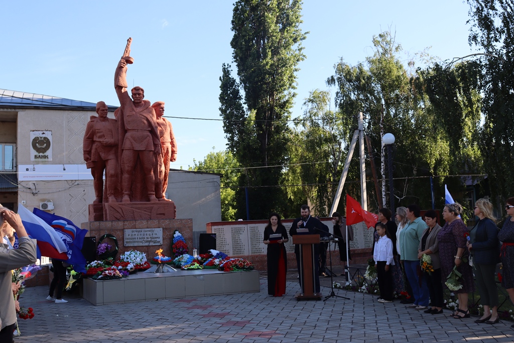 В Романовском районе митинг возле памятника воинам-романовцам, погибшим в годы Великой Отечественной войны, начался рано утром. Ведущие Н. Кондратьева и Р. Воронин произносят скорбные цифры: более 7000 воинов ушло на фронт, больше 4000 не вернулось домой. Право открыть митинг предоставлено главе Романовского муниципального района А.И. Щербакову: «Дорогие романовцы! Фронтовое поколение доверило нам память о своем великом подвиге и великой жертве, ценой которой завоевана Победа. Выражаю надежду, что День Победы и День памяти и скорби навсегда будут святыми для нас датами, которые напоминают нам, что главная ценность на Земле - это мирная жизнь! В этот скорбный день мы вспоминаем и наших дорогих ветеранов, тружеников тыла - всех тех, благодаря кому была завоевана Великая Победа, и преклоняем голову перед памятью не вернувшихся с войны». Минутой молчания романовцы почтили память всех не вернувшихся с полей сражений. Пронзительно звучат слова «Реквиема» Р. Рождественского, который читает Мирослава Педанова: «Через века, через года, - помните! О тех, кто уже не придет никогда, - помните!». Как никогда актуально и остро звучит каждое слово, произнесенное на митинге, в те дни, когда фашизм, с которым боролись наши деды и прадеды, снова поднял голову. А. Булдыгина исполняет песню «Солдаты не умирают». Память наша живет, пока мы ее сохраняем, пока помним, какой ценой завоевана Победа.