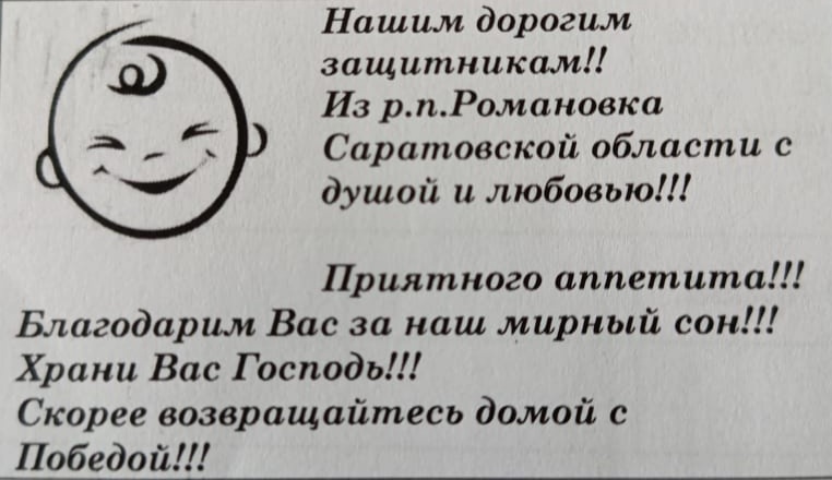 Первоначально мы встретились с координатором группы «СвоихНеБросаем. Романовка» Евгенией Панфиловой и она рассказала о том, какую неоценимую помощь оказывают наши земляки фронту, помогают нашим бойцам не чувствовать себя оторванными от дома, передавая частичку своего тепла вместе с продуктами. Они даже придумали такой вот квиточек, который кладут воинам в каждую коробку или пакет. На нем написано «С душой и любовью из Романовки». Наверняка ребятам на фронте на душе будет теплее и спокойнее.