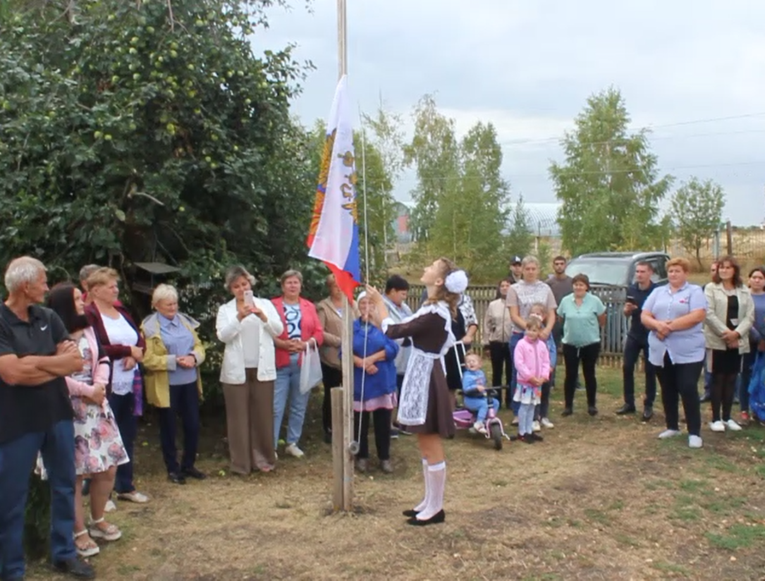 И вот на линейке появились настоящие первоклашки (в этом году их всего трое) вместе с выпускниками 2022-2023 учебного года. Звучит гимн России. Право поднять государственный флаг России предоставляется ученице 11 класса Яне Дружиной. Торжественная линейка, а значит и новый, юбилейный учебный год – открыты!