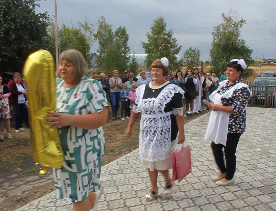Вся школа построена на торжественную линейку. Ведущие – учителя Е.Е. Игнатова и М.А. Селиверстова – объявляют выход первоклассников. Под звуки веселой детской песни «Чему учат в школе» с большой единичкой в руках в праздничной школьной форме из дверей появляются… учительница Елена Борисовна Кабанова, школьный повар Татьяна Ивановна Атапина и социальный работник Вера Михайловна Селиверстова! Конечно же, у многих присутствующих их появление вызвало улыбку и недоумение. Но вскоре все становится понятным - они тоже были первоклассницами, но только 45 лет назад. И сегодня они представляли наш самый первый «1 класс», в котором тогда, в далеком 1977 году, было 13 учеников. Очень волнуясь, повзрослевшие «первоклассницы» прочитали стихи, получив за это статус почетных гостей.