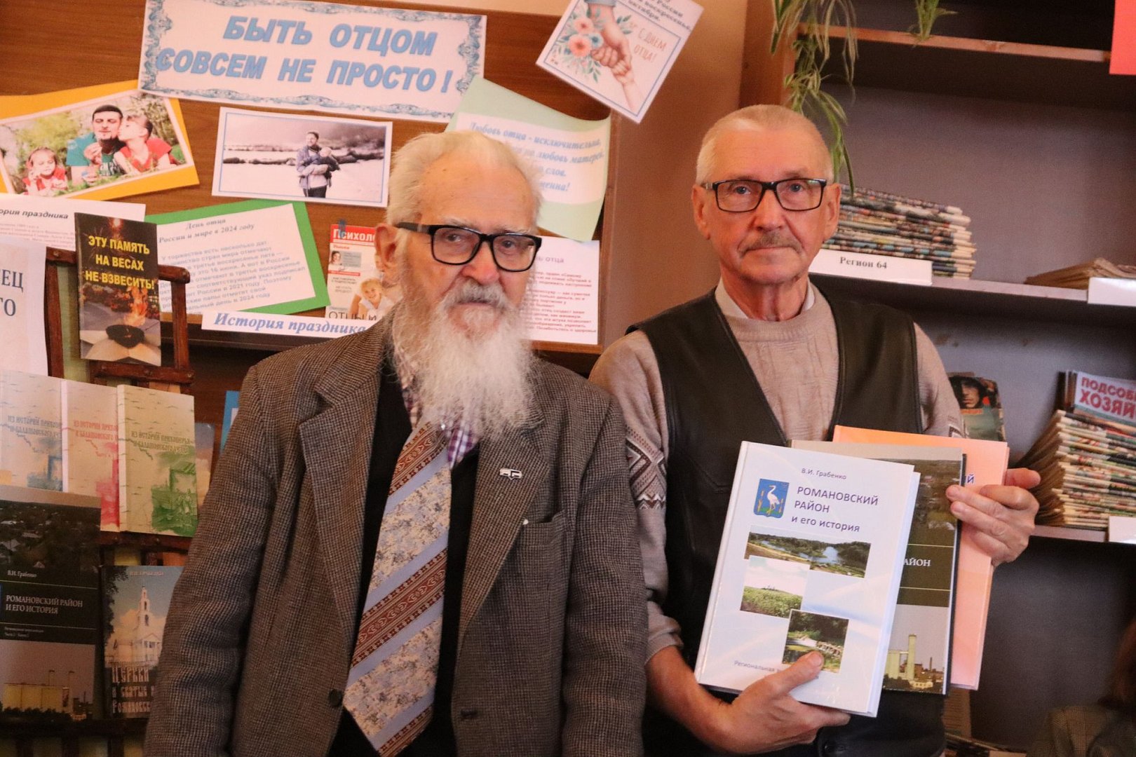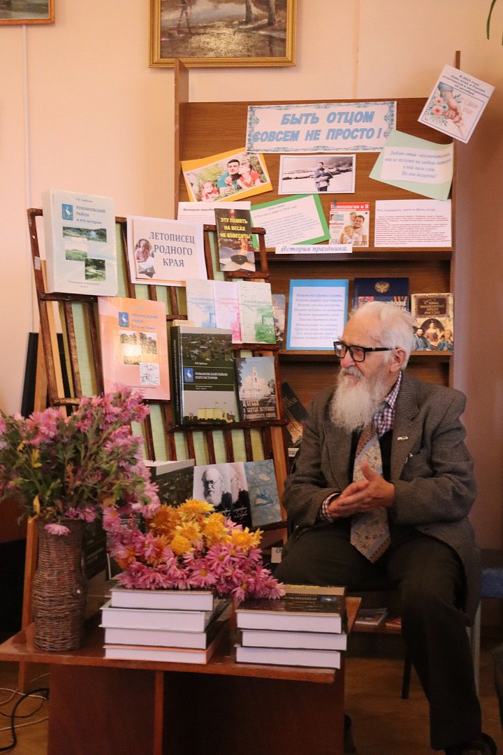 Благодаря поддержке меценатов А.Н. Рязанова и Ю.А. Ставицкого книга поступит в библиотеки сел района и школьные библиотеки. А благодаря участию руководства района, депутатского корпуса, неравнодушных жителей книга была издана в запланированном к выходу тираже. В этот день взволнованного и растроганного автора поздравили уважаемые гости. Глава Романовского муниципального района А.И. Щербаков отметил огромную скромность Виктора Ивановича, поблагодарил его за бесценный вклад в написание истории Романовского района. В этот день были теплые и символические подарки с пожеланием здоровья и творческих дальнейших поисков. Председатель Муниципального Собрания Н.В. Швецов отметил, что постарался уже ознакомиться с новым томом энциклопедии краеведа, подчеркнув, что труд В.И. Грабенко останется на века. Поздравления прозвучали от соратника и друга Виктора Ивановича, краеведа села Пады Владимира Александровича Захарова, который много лет провел в архивах города Балашова вместе с виновником торжества, с ним его связывает добрая творческая дружба. От членов Общественного совета поздравления адресовала его председатель М.В. Андреева. Эта презентация - встреча в кругу друзей получилась очень уютная и по-домашнему теплая, жители подходили за автографами, адресовали добрые слова и пожелания. А это самое главное признание для автора, который вкладывает много времени в создание книги, иногда не ожидая обратного ответа. И, конечно же, в завершение презентации - общее фото на память о моменте, который навсегда стал историей нашего района. Творческие номера в этот день прозвучали в исполнении Н. Ковардаева, А. Булдыгиной, юных участников театральной студии «Линия», В. Брюткина, А. Козловой.