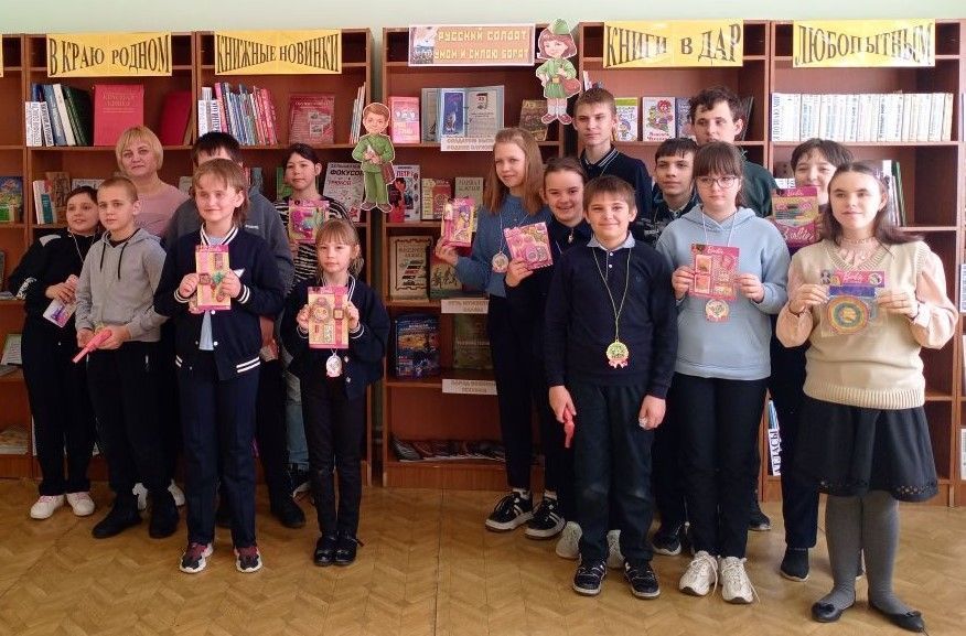 Поделившись на две команды, ребятам представилась замечательная возможность — почувствовать себя солдатом, попробовать свои силы, участвуя в конкурсах: «Загадки на военную тематику», «Доставь пакет», «Стрелок», «Юнга», «Собери волю в кулак», «Отчаянные снайперы» и заключительный «Самый галантный», где мальчики пригласили девочек на танец. В итоге победила дружба, всех участников наградили медальками и памятными призами. Ребята весело и интересно провели время. В завершение программы читатели познакомились с книжной выставкой «Русский солдат умом и силою богат».
