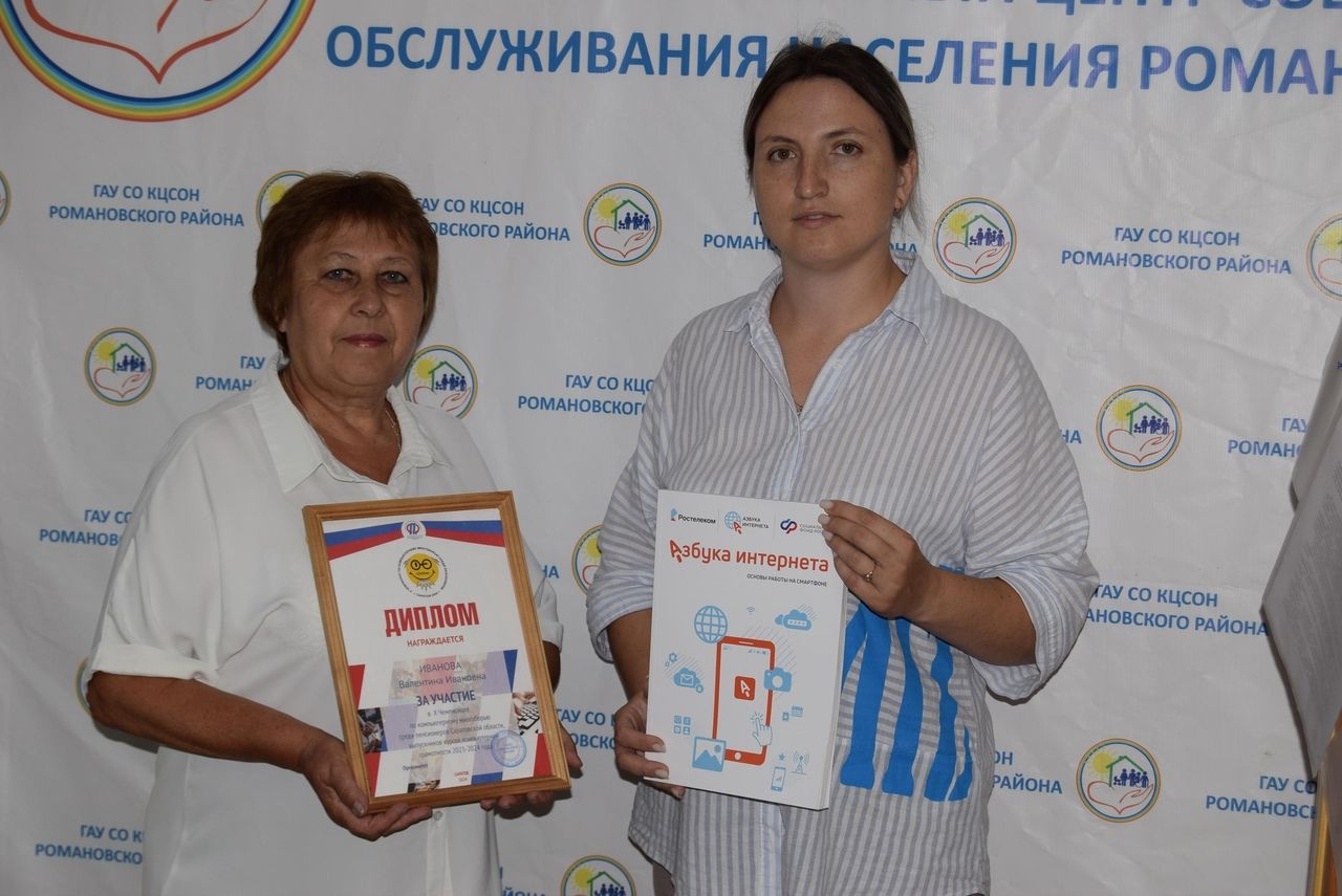 Получатель социальных услуг комплексного центра социального обслуживания населения Романовского района награждена дипломом за участие в X областном чемпионате по компьютерному многоборью среди пенсионеров.