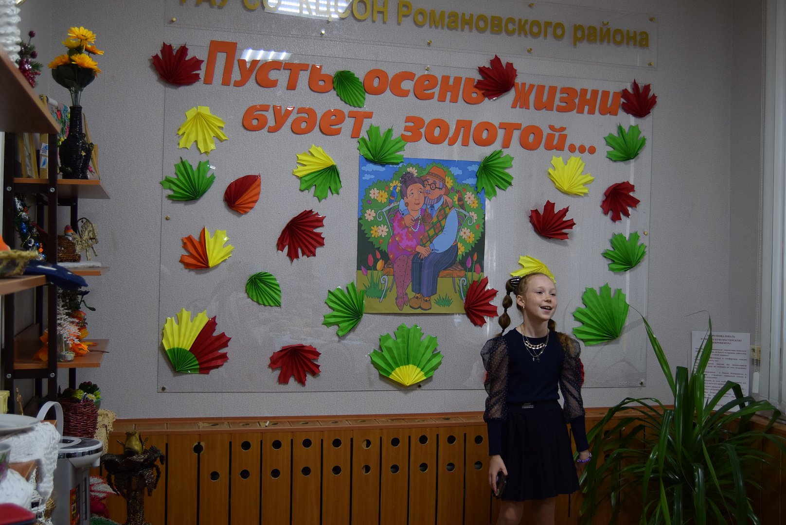 В начале мероприятия специалист центра поздравила и провела небольшую «осеннюю» викторину, после которой выступила Кира Арюшина, прочитав стихотворение. Артисты Романовского РДК подарили участникам музыкальное исполнение. Участники клуба поговорили об урожае этого года, познакомились с новыми кулинарными рецептами, поделились опытом.