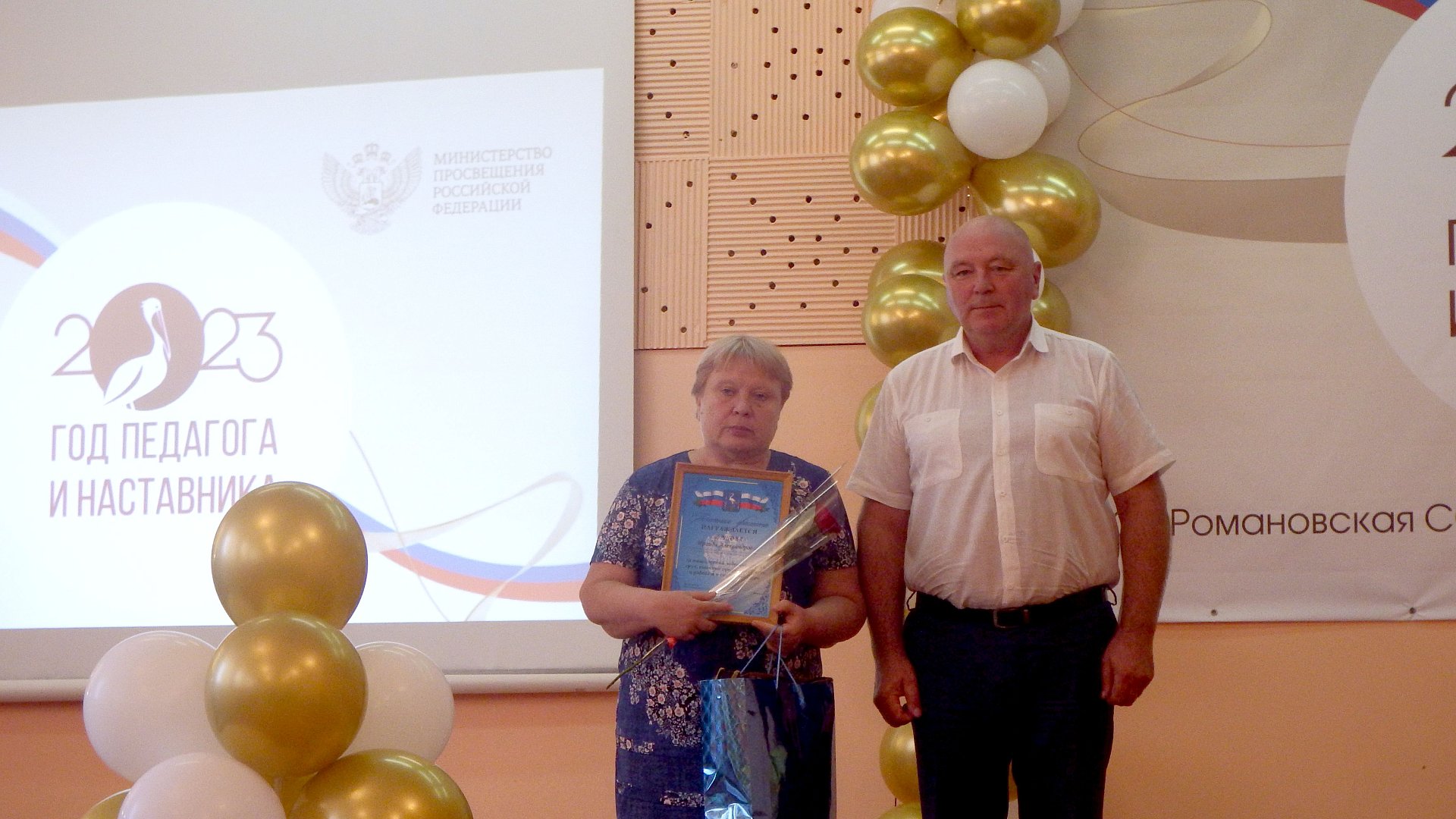Почетными грамотами главы Романовского района за многолетний добросовестный труд отмечены: С.Н. Саяпина, учитель информатики (филиал Романовской СОШ в с. Бобылевка), Л.С. Горловая, учитель начальных классов (Подгорненская СОШ), Ю.А. Дедов, педагог центра «Точка роста» (Романовская СОШ), В.А. Попова, учитель начальных классов (Романовская СОШ), Е.М. Болкунов, музыкальный руководитель (д/с «Сказка»).