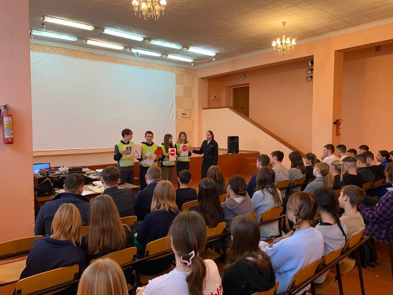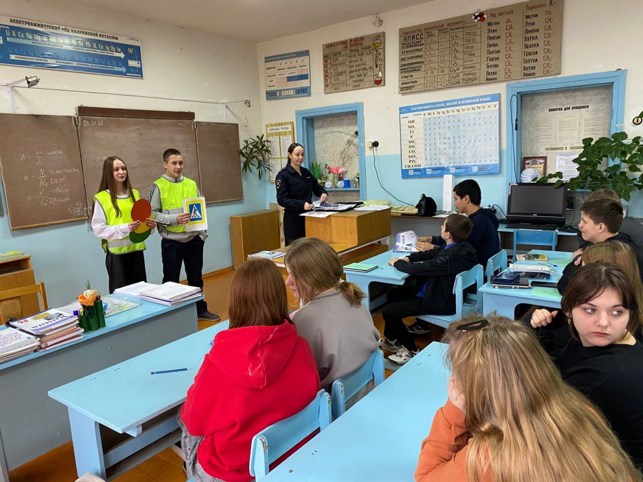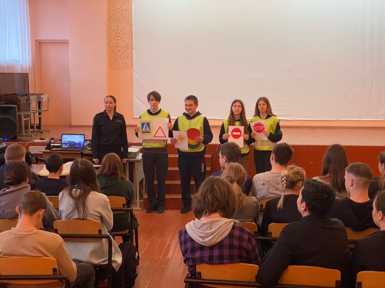Учащимся средних классов были разъяснены правила безопасного поведения вблизи проезжей части. Полицейский и «юные инспекторы движения» напомнили детям, что, прежде чем начать движение, необходимо убедиться в отсутствии транспорта и только после этого переходить проезжую часть. Рассказали ученикам, что такое безопасный маршрут, для чего нужны световозвращающие элементы на одежде и как они помогают пешеходам в темное время суток.