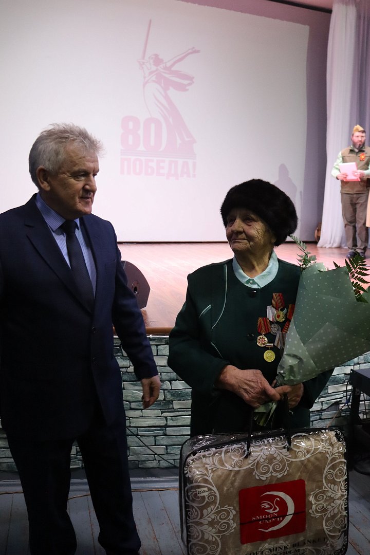 В формате праздника началось вручение юбилейных медалей «80 лет Победы в Великой Отечественной войне». Первой ее получила труженица тыла Раиса Архиповна Булатова. Медаль вручил глава Романовского муниципального района А.И. Щербаков. Поздравляя всех присутствующих в этот день со сцены, Алексей Иванович отметил, что это возможность сказать «спасибо» ветеранам. Защита Отечества была, есть и будет священным долгом каждого. В торжественной обстановке назвали и имена участников различных локальных войн и конфликтов, всех, кто защищал интересы нашей страны за пределами Отечества, в том числе в Афганистане. Памятные подарки вручил глава района воинам-афганцам, в том числе среди награжденных всегда сестра погибшего воина-интернационалиста В. Синдеева.