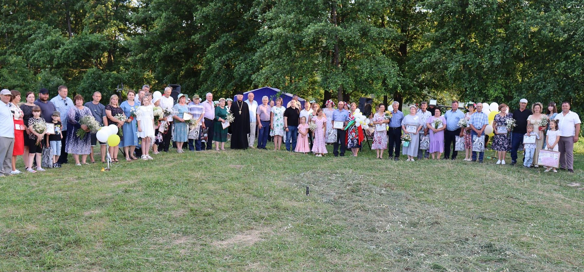Все участники торжества приветствовали эти семьи аплодисментами, Супруги собрали из пожеланий символическую ромашку, прикрепив к ней лепестки с пожеланиями, кружились на поляне в вальсе. В их честь к небу взмыли импровизированные фонтаны искр и, конечно, прозвучало неизменное слово, соединяющее сердца супругов - «Горько!».