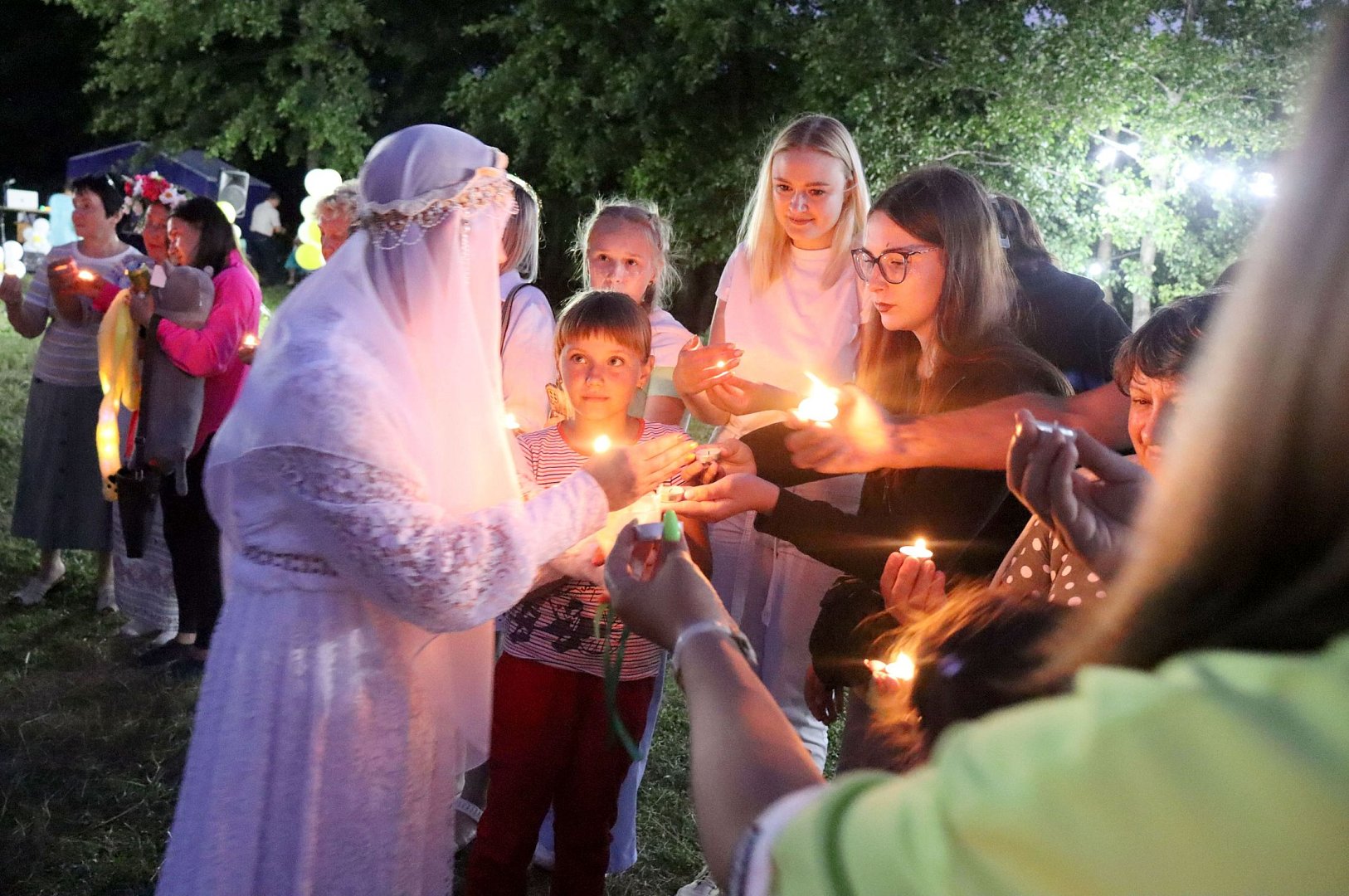 Как отметили ведущие, «этот праздник напоминает нам про те идеалы, к которым должны стремиться все семьи. А идеалом супружества, любви и верности является семья святых Петра и Февронии». Когда уже село солнце, Петр и Феврония прибыли на наш праздник. Все мы стали участниками одной масштабной и завораживающей сердце церемонии - зажжения свечей. Словно сотни сердец одновременно зажглись на поляне, образовав круг, внутри которого оказались наши номинированные супружеские пары. В этом действе всегда есть что-то волшебное и доброе, но вместе с тем яркое, согревающее, буквально, общим теплом.