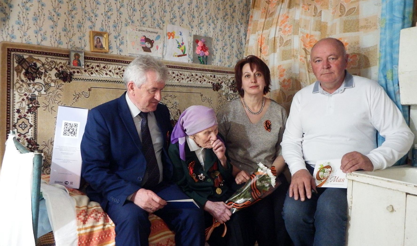 Перед праздником Великой Победы руководство района поздравило их с Победой. Традиционно и ежегодно эти поздравления они ждут. К сожалению, из ветеранов, участвовавших в боевых действиях на фронтах Великой Отечественной, у нас осталась Раиса Тимофеевна Белоцерковская. Ей сегодня идет 101 год! С наилучшими пожеланиями, поздравлениями, подарками и цветами к ней приехали: глава района А.И. Щербаков, председатель Муниципального Собрания Н.В. Швецов, руководитель КЦСОН С.П. Хохлова. Раиса Тимофеевна проживает с дочерью, которая дает ей свою заботу и уход, помогает и социальная служба.