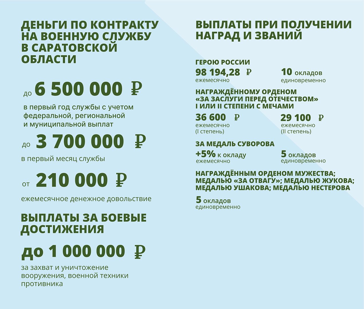 Таким образом, с учетом различных дополнительных выплат саратовские контрактники могут получить уже в первый месяц службы до 3,7 млн рублей. За первый год службы - до 6,5 млн рублей.