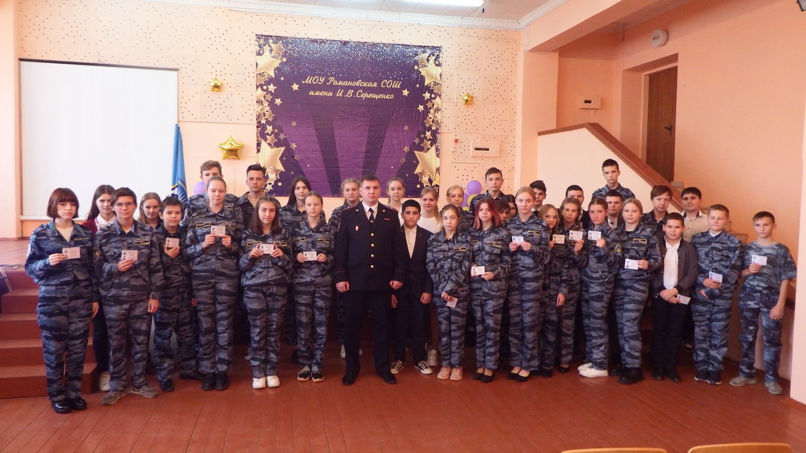 Ребят собрали в этот праздничный день, чтобы вручить им именные членские билеты, выданные органами полиции. Это один из важнейших документов в жизни ребят, он позволит им участвовать в правоохранительной деятельности наряду с полицейскими, а именно участвовать в общественных и разъяснительных акциях, учить и ориентировать своих сверстников, конечно, все это совместно со взрослыми наставниками. Перед учащимися выступила директор Романовской школы С.А. Семенова, поздравившая их с получением документа и пожелавшая успехов в дальнейшем. Проводила данное мероприятие педагог Романовской СОШ, куратор деятельности отрядов «Юный друг полиции» от школы Т.А. Рудова. После вступительного слова она пригласила на сцену гостя. Членские билеты ребятам вручал начальник ОП №1 (Романовское) МО МВД России «Балашовский» майор полиции Н.Ю. Коробов. Он также обратился к ребятам с приветственным словом, пожелав, чтобы в будущем кто-то из них связал свою жизнь со службой в правоохранительных органах, службой народу. После этого школьникам в торжественной обстановке были вручены членские билеты ЮДП.